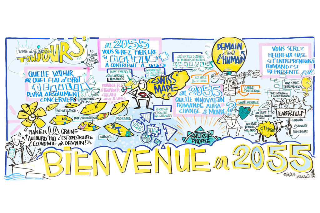 Les invité·es ont également eu l’opportunités d’imaginer ce que pourraient être GENILEM et l’entrepreneuriat romand en 2055. Une expérience participative et créative, qui a donné lieu à une fresque dessinée en direct à partir des réponses collectées.