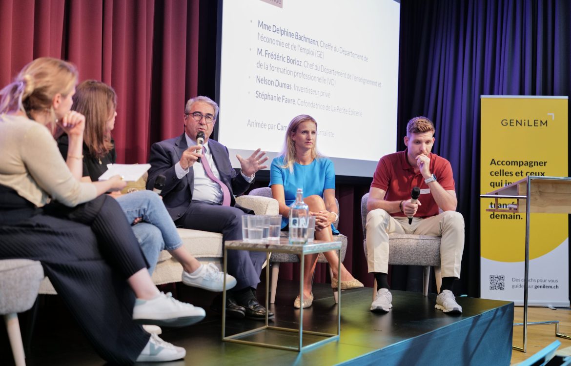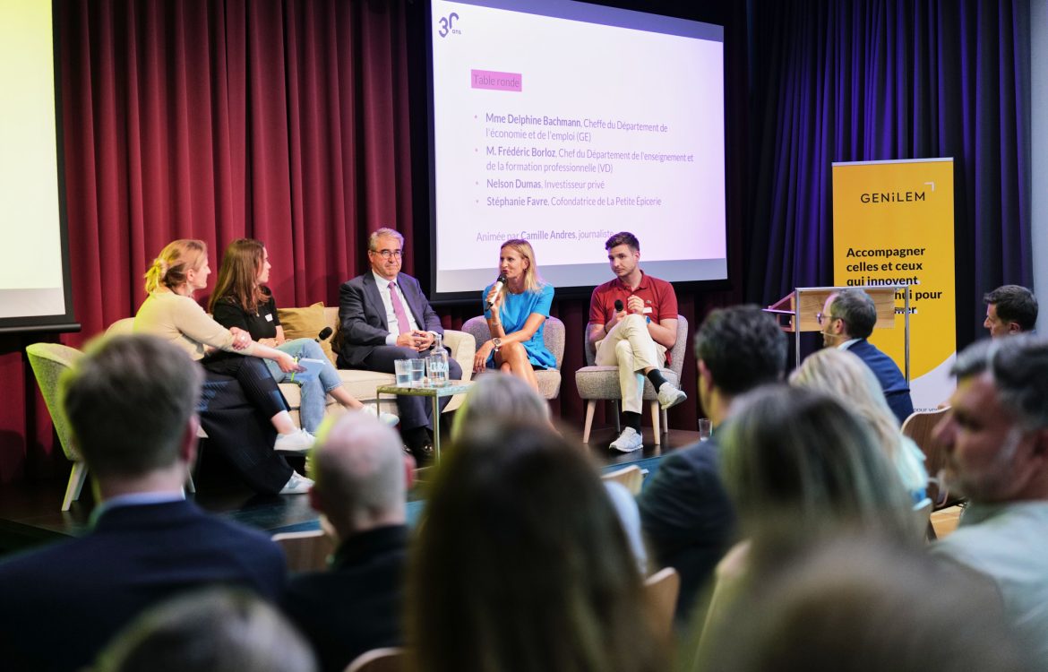 Et c’est en famille que GENILEM a fêté ses trois décennies le 18 juin 2025, entourée de plus de 150 invité·es venus pour mesurer le chemin parcouru et imaginer ensemble les prochaines étapes pour l’association. La soirée a été rythmée par une table ronde autour de deux défis majeurs : comment mieux financer les jeunes entreprises, et comment développer la culture de l’innovation en Suisse romande. Pour en discuter, Delphine Bachmann, Cheffe du Département de l’économie et de l’emploi du Canton de Genève , Frédéric Borloz, Chef du Département de l’enseignement et de la formation professionnelle du Canton de Vaud , Stéphanie Favre, co-fondatrice de la Petite Epicerie et Nelson Dumas, investisseur privé, étaient réunis autsur scène.