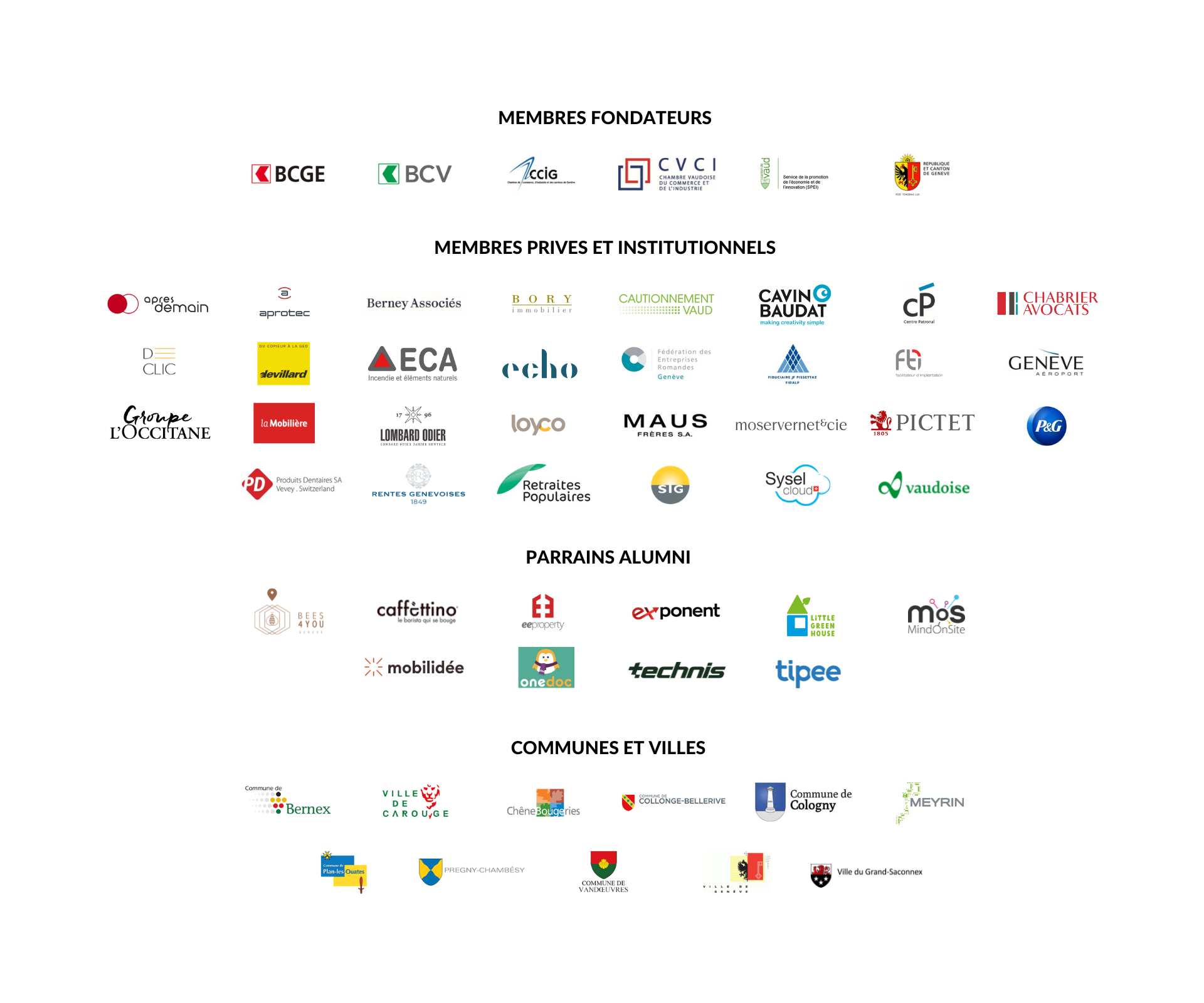 le tissu économique du bassin lémanique (Vaud et Genève) en favorisant la création d’entreprises innovantes, viables et responsables et en créant des ponts entre nos entreprises alumni et les jeunes pousses romandes